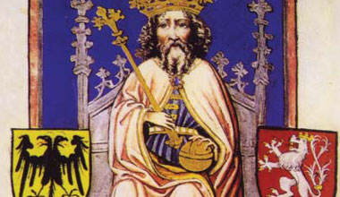 Fig.: Emperor Charles IV on a throne between the heraldic arms of the Empire (the double-headed eagle) and those of Bohemia (the double-tailed lion). Painted book illustration from Nuremberg, around 1430, after an original of 1360; SMB PK, Kupferstichkabinett.